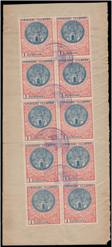 Vzácne použite mestských poplatkových kolkov v desať bloku. Na výstrižku z dokumentu sú kolky nominálnej hodnoty 1 KORONA. Znehodnotené sú okrúhlou pečiatkou vo fialovej farbe. Po obvode je umiestnený text „* BANSKEJ ŠTIAVNICE A BELEJ * ÚRAD“. Zvyšok pečiatky je nečitateľný.