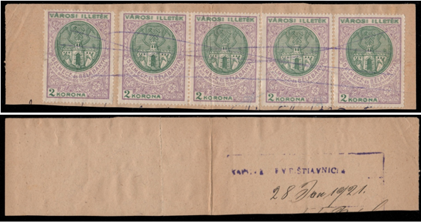 Použitie piatich kolkov nominálnej hodnoty 2 KORONA na dokumente v Banskej Štiavnici zo dňa 28. január 1921. Kolky sú znehodnotené preškrtnutím ceruzy vo fialovej farbe. Výstrižok obsahuje štvorpásku a samostatný kolok.