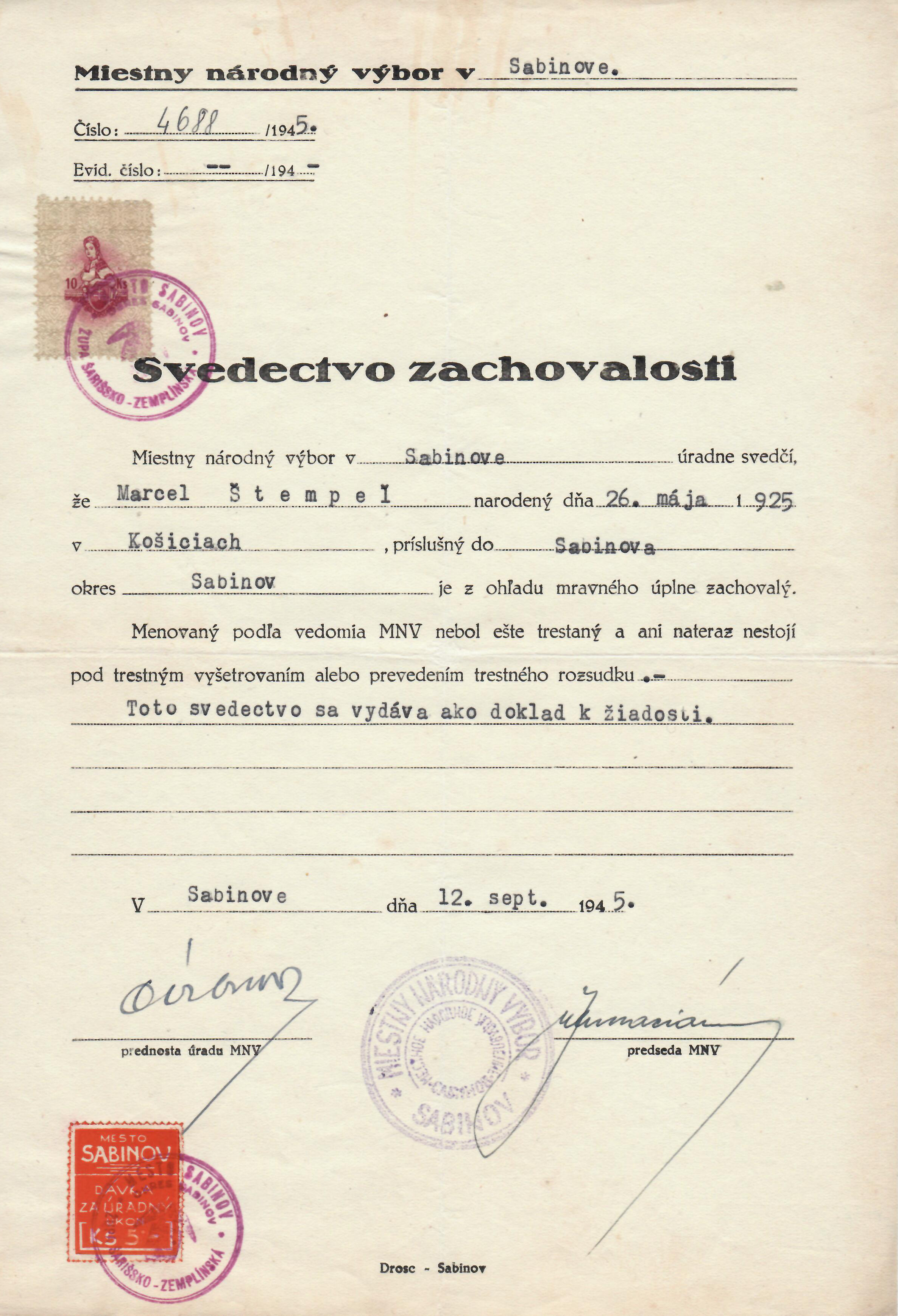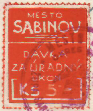 Použitie mestského kolku nominálnej hodnoty 5 Ks súbežne so štátnym kolkom 10 Ks druhej emisie vydaných počas obdobia Slovenského štátu. Kolky boli použité na tlačive „Svedectvo zachovalosti“. Obidve kolkové známky sú znehodnotené okrúhlou pečiatkou mesta Sabinov v cyklámenovej farbe s textom „MESTO SABINOV, OKRES SABINOV, ŽUPA ŠARIŠSKO – ZEMPLÍNSKA“. Tlačivo „Svedectvo zachovalosti“ vytlačila firma Drosc – Sabinov. Tento dokument pochádza zo dňa 12. septembra 1945 a bol potvrdený podpismi prednostu úradu MNV a predsedu MNV. Zároveň je v strede okrúhla pečiatka vo fialovej farbe „MIESTNY NÁRODNÝ VÝBOR SABINOV“. Mesto Sabinov bolo oslobodené 21. januára 1945. Dokument bol vydaný po rozpade Slovenskej republiky 1939 – 1945. Ide teda o dokument vydaný v období Československej republiky, kedy ešte boli v platnosti kolkové známky Slovenskej republiky.